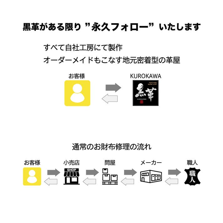 職人による仕上げは美しく丈夫なだけでなく、修理等のメンテナンスなどのアフターフォローも万全です。ホックの打ち換え、ファスナー交換、糸のほつれなどの修理は早急に対応できる利点があります。