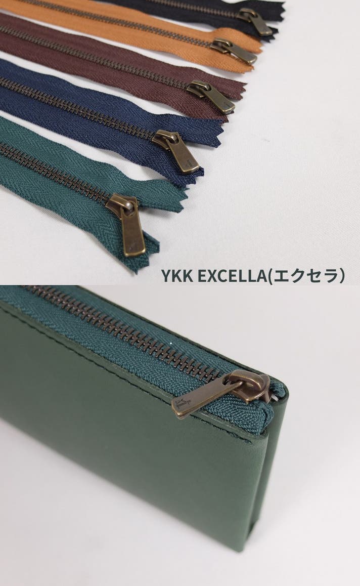 世界に誇るYKKの高級ファスナーエクセラを使用。他のメタルファスナーとは違い、エレメントの1つ1つの全面に入念に磨きをかけており、スライダーの滑りもとてもなめらかなファスナーです。