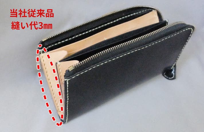 また、縫い幅にもこだわりが。通常は3.2㎜ほどで縫うのですがファスナー幅を多く取るために2.2㎜幅で縫っております。